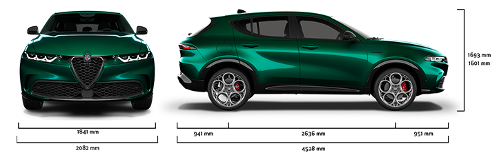 El Tonale Plug-in Hybrid Q4 mide 4.528 mm de largo, 2.082 mm de ancho y 1.693 mm de alto. El baúl ofrece una capacidad máxima de 385 litros.